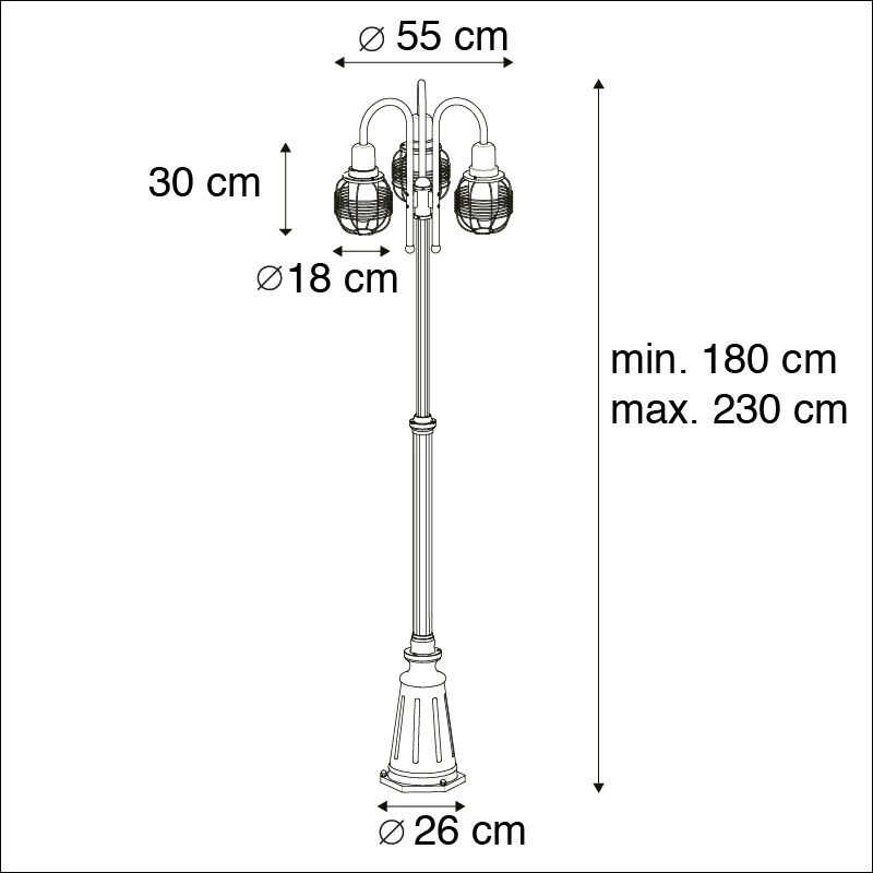 Was für eine coole Außenleuchte! Die schwarze Guardado besteht aus Metall mit Aluminium und Glas. Sie hat einen Durchmesser von 55 cm und eine Gesamthöhe von 180 cm, die bis zu 230 cm lang eingestellt werden kann. Die drei Schirme haben jeweils einen Durchmesser von 18 cm und eine Höhe von 30 cm. Die Basis hat einen Durchmesser von 26 cm. Die Guardado ist mit drei E27-Fassungen (jeweils max. 60 Watt) ausgestattet, die Leuchtmittel müssen separat bestellet werden. Außerdem lässt sich diese Leuchte mit einem externen Dimmer dimmben. Mit einem IP-Wert von IP44 ist die Außenleuchte spritzwassergeschützt. Verleihe deinem Garten mit dieser wunderschönen Guardado-Laterne eine ländliche Atmosphäre.